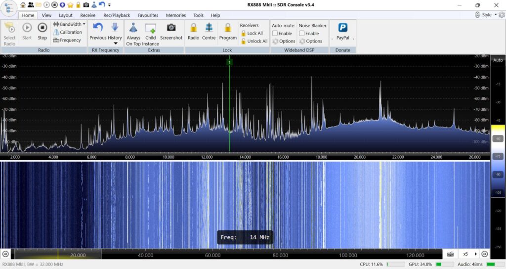 I decided to connect a 64:1 Unun fed by a 100ft long wire – this connects directly to the choke which is connected to the RX888. Interestingly the VDSL interference from 8.5MHz to 12MHz isn’t notcieable and a noise drop off occurs around 10MHz